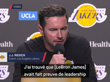 Dans la nuit de jeudi à vendredi, les Los Angeles Lakers se sont imposés sur le parquet des Golden State Warriors (119-103) grâce notamment à un très bon LeBron James (26 points, 8 rebonds, 11 assists). Et son coach J.J. Redick n'a pas manqué de la saluer en conférence de presse.